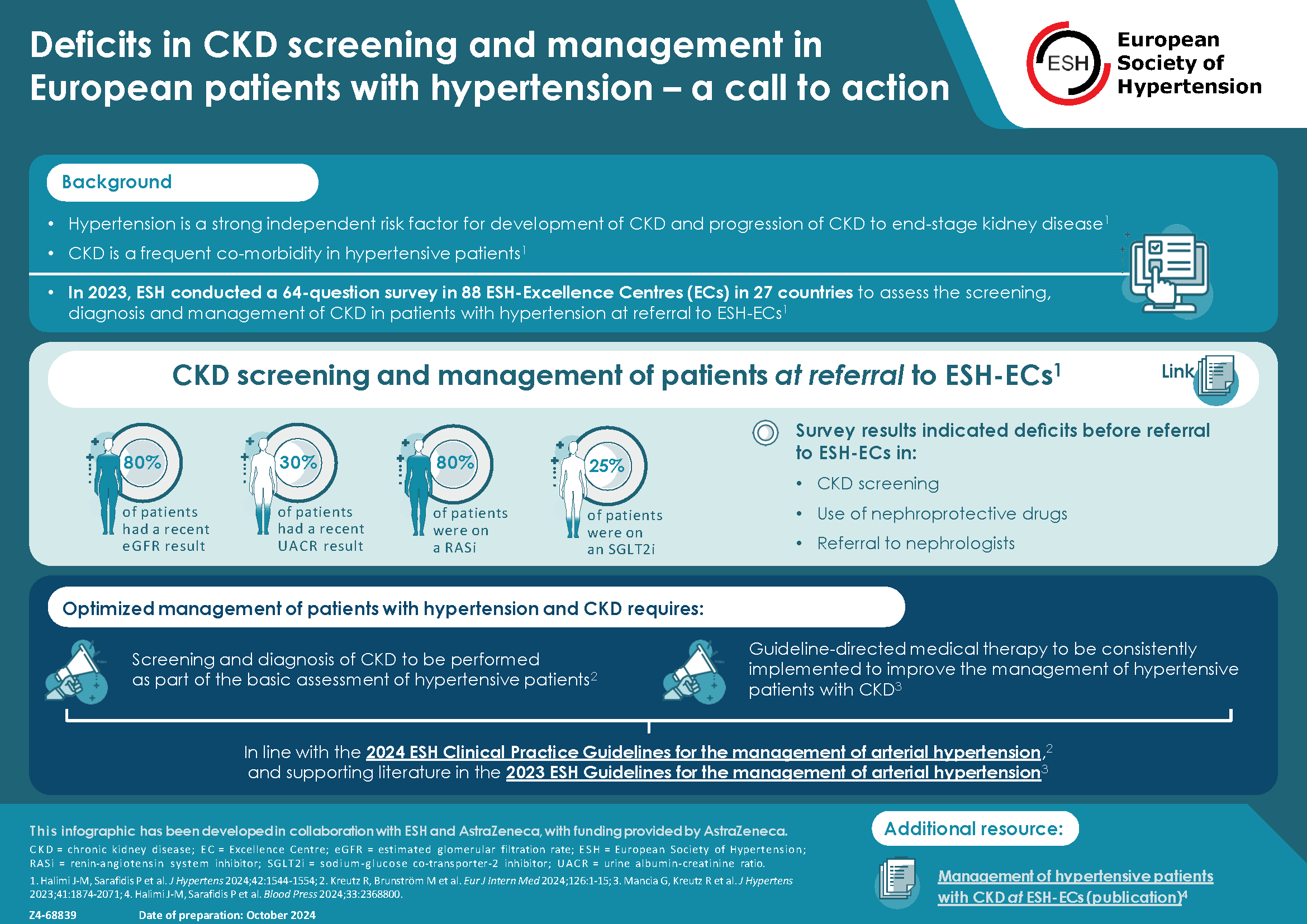 In 2024, the ESH conducted a survey among its Excellence Centres on CKD management in hypertensive patients. The findings have been published in two papers, available here: